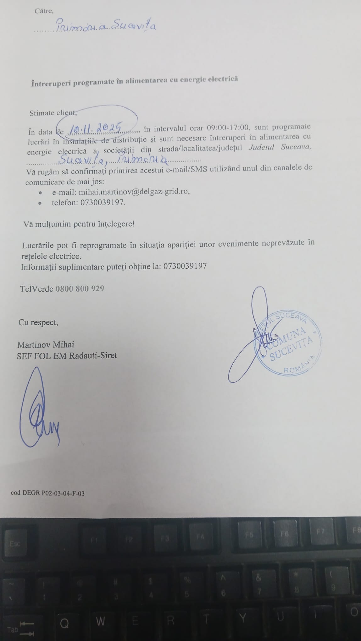 Vă rugăm să vă luați măsurile necesare pentru a reduce disconfortul cauzat de această întrerupere. Pentru informații suplimentare, puteți contacta Delgaz Grid la numărul 0730039197 sau la adresa de e-mail mihai.martinov@delgaz-grid.ro.