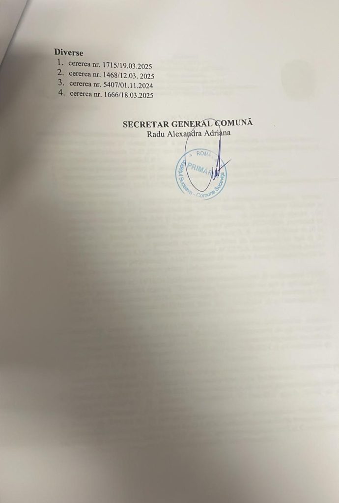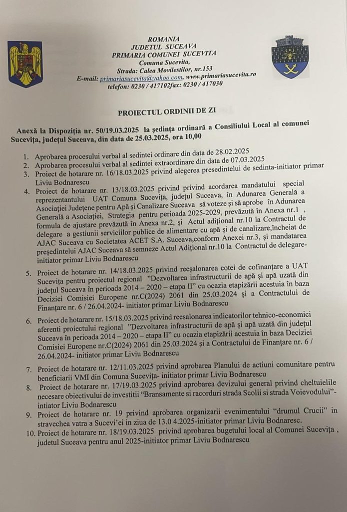 Proiect de ordine de zi, anexă la ședința ordinară a Consiliului Local al Comunei Sucevița din data de 25.03.2025